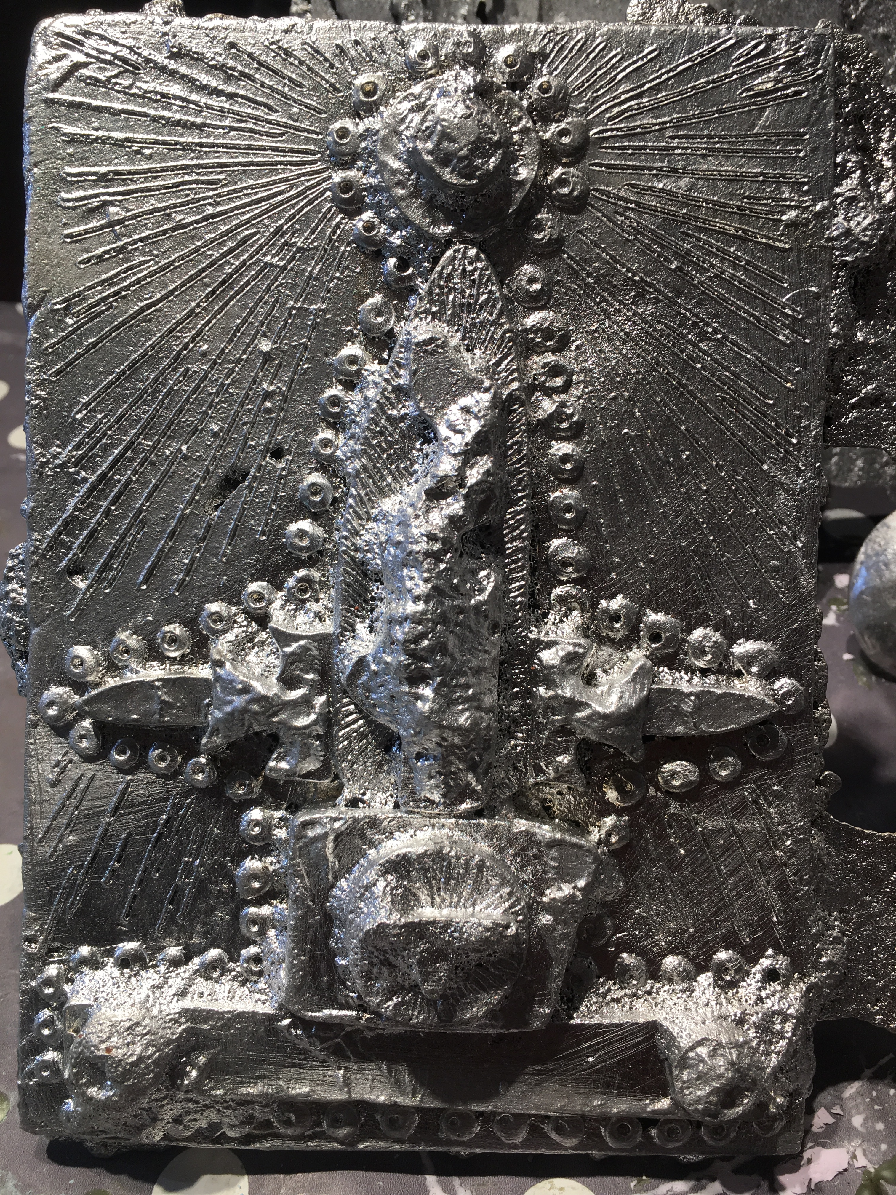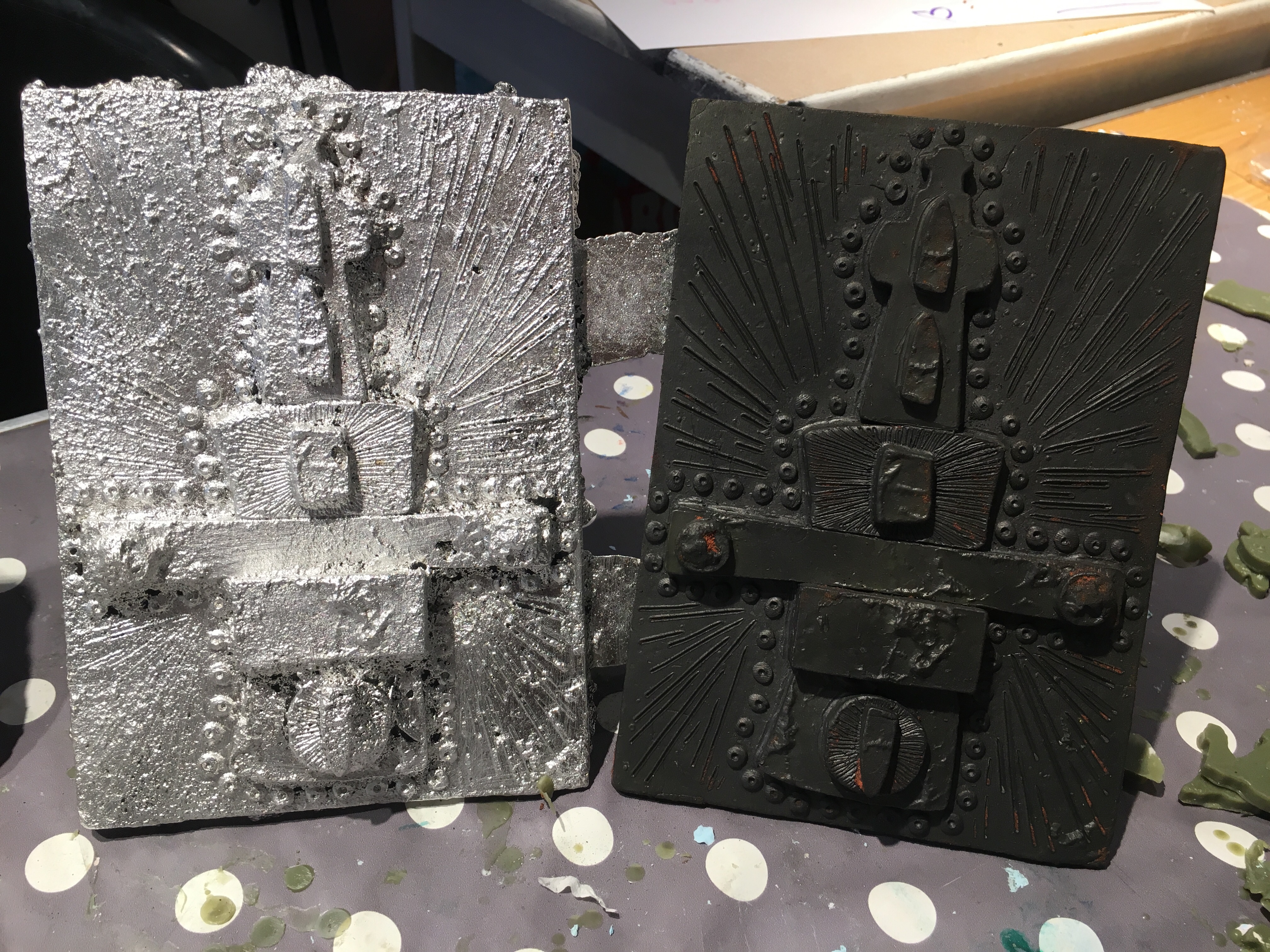 Over the course of the week before the demonstrations I have been making up some decorative wall pieces. To me these almost resemble icons or religious imagery or symbols , but with out a know. denomination. I’m really enjoying the idea of developing fake relics.