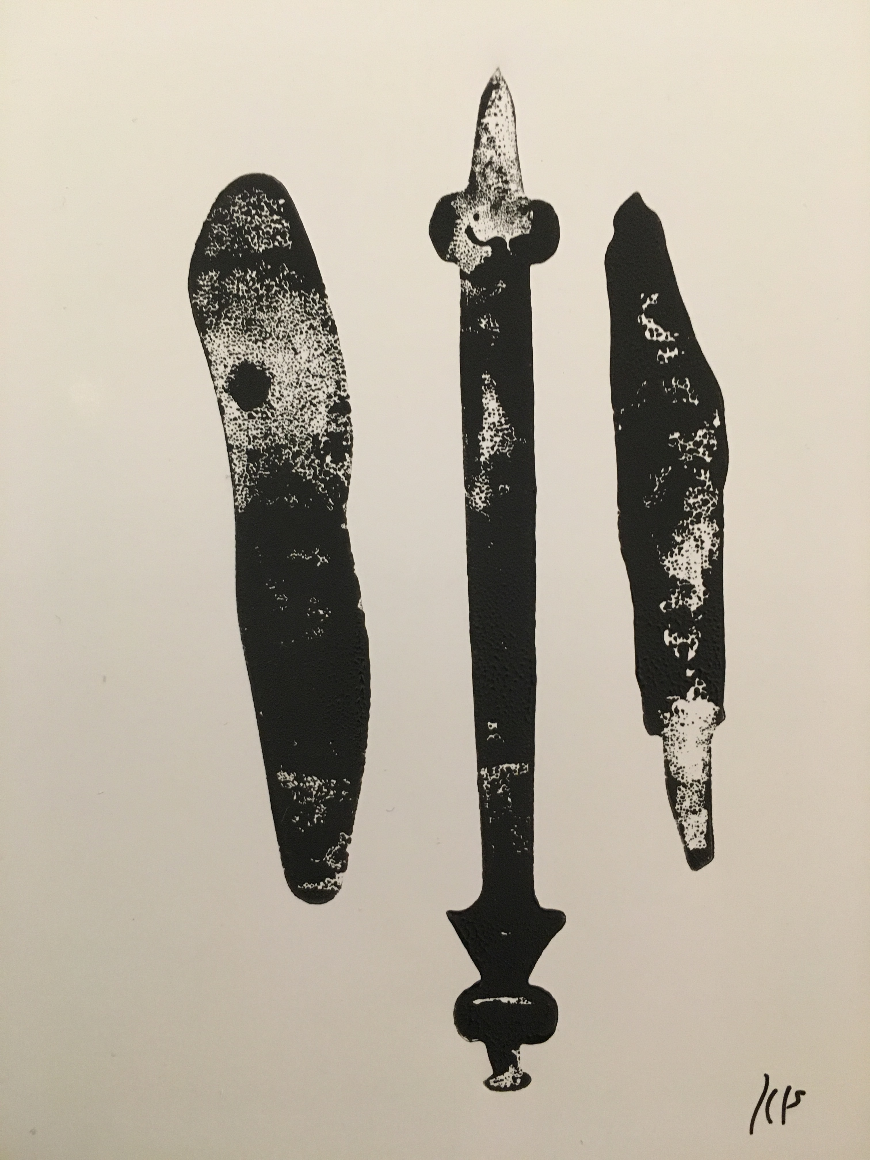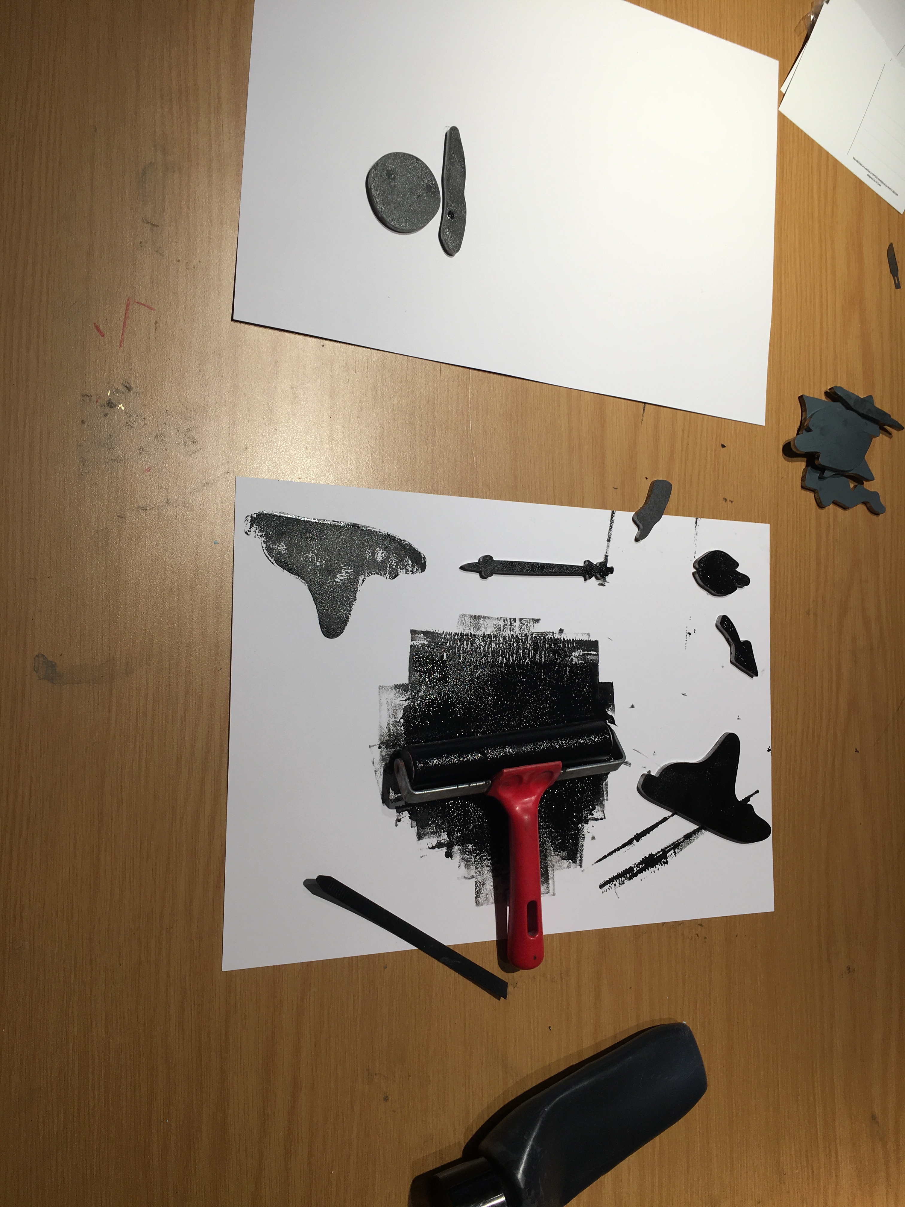 Using a printing ink and roller I spread ink on the steel shapes I had cut out in 5mm steel. These became effective printing blocks and I was able to make some one off post card prints that will be available for sale in the sculptural gift shop once the show opens.