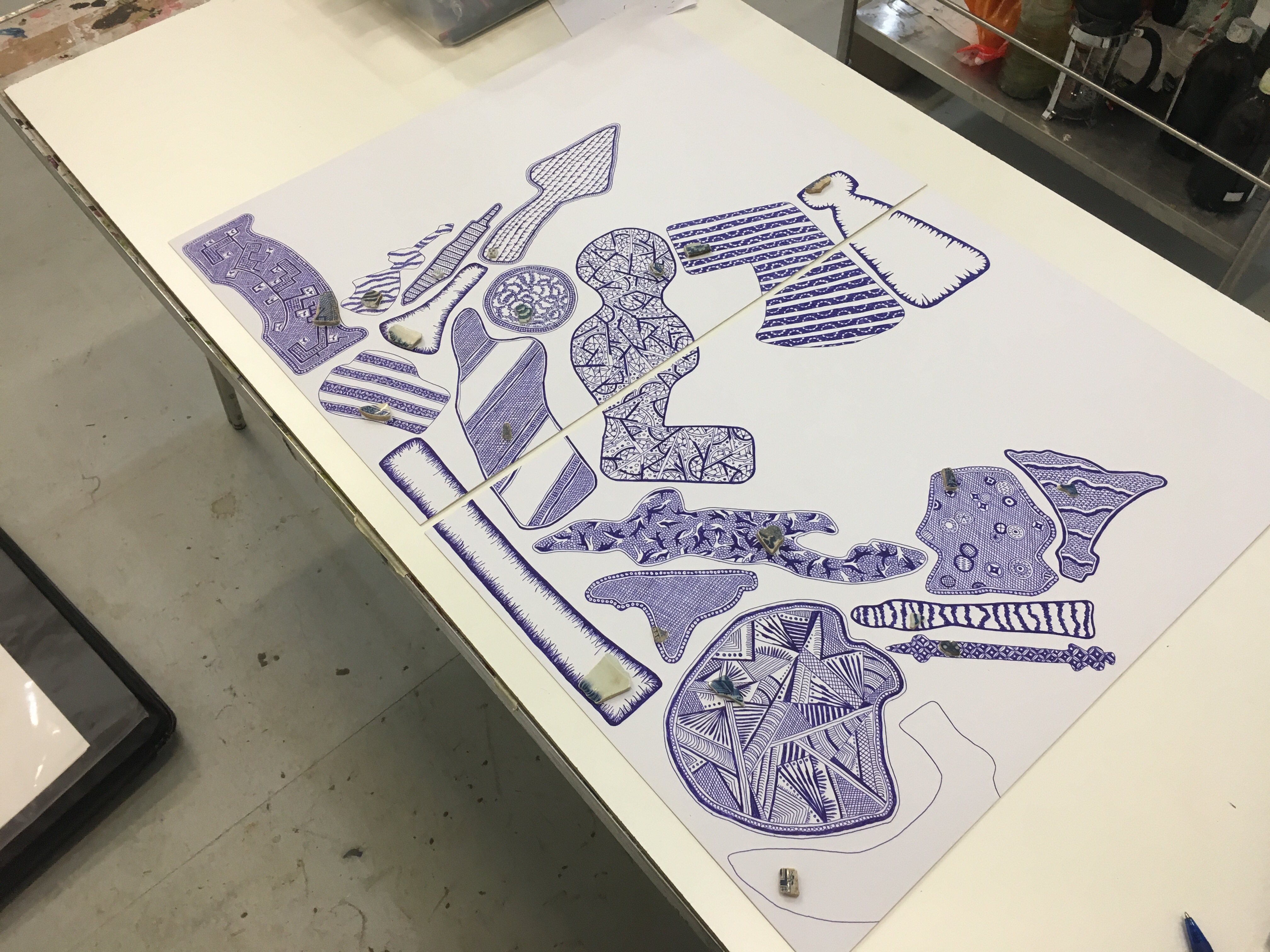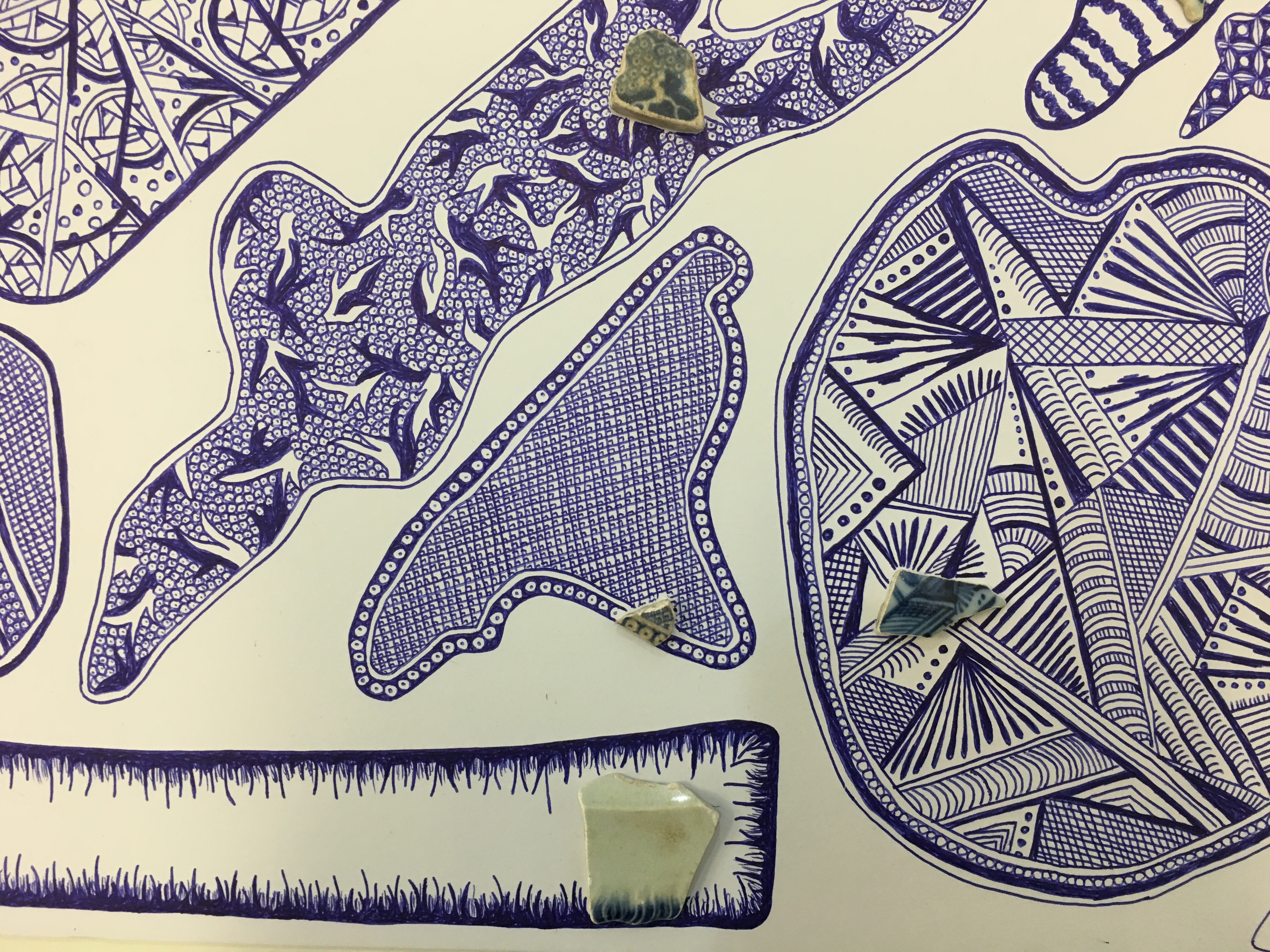 I’ve been working on a set of very detailed drawings using biro. I went Mudlarking on the banks of the river Thames and found bits of pottery which I have used to influence the pattern on the shapes I took from the packaging.
